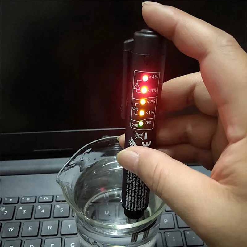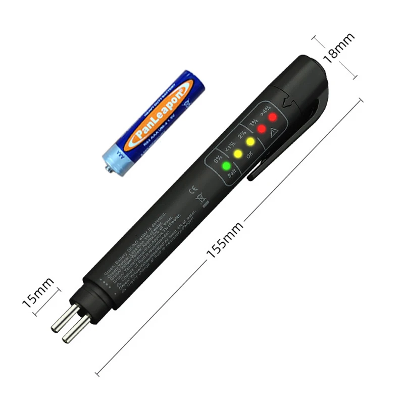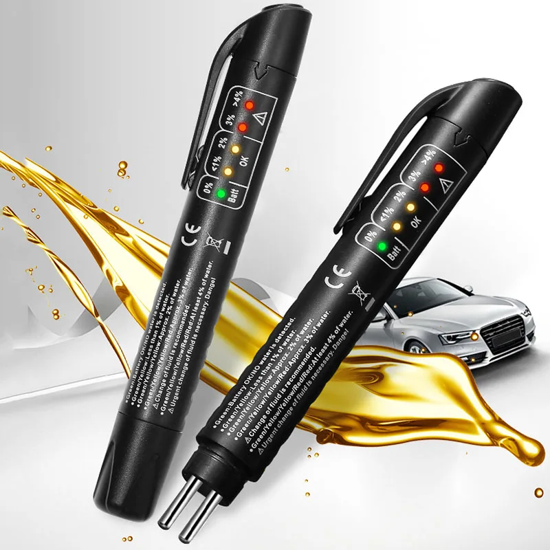 The car brake oil testing pen features 5 LED lights to display the percentage of moisture content in the brake fluid, an easy to read visual signal.