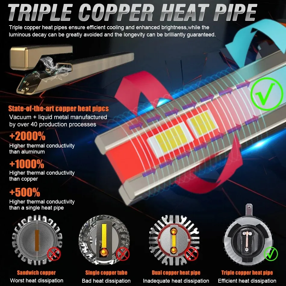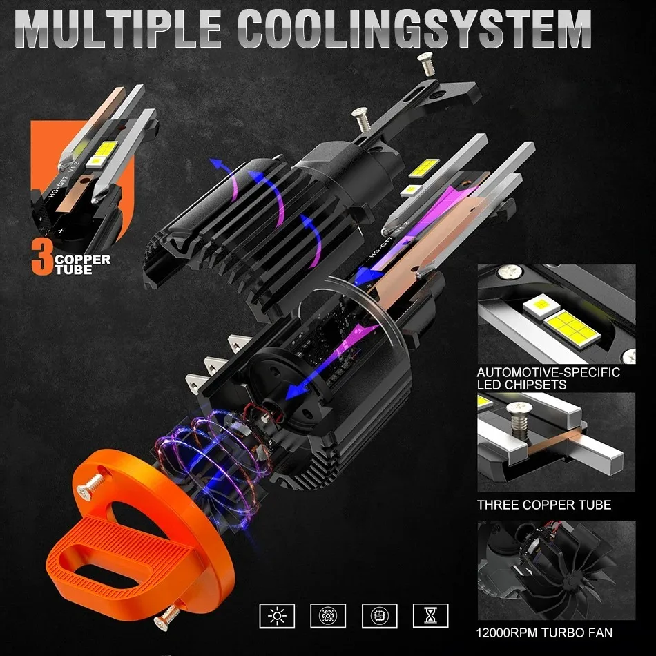 – Advanced Heat Dissipation System: Our headlights come equipped with an exceptional heat dissipation system, utilizing a combination of copper pipes and high-powered fans to efficiently dissipate heat.