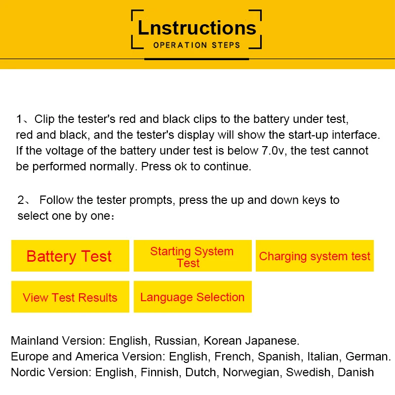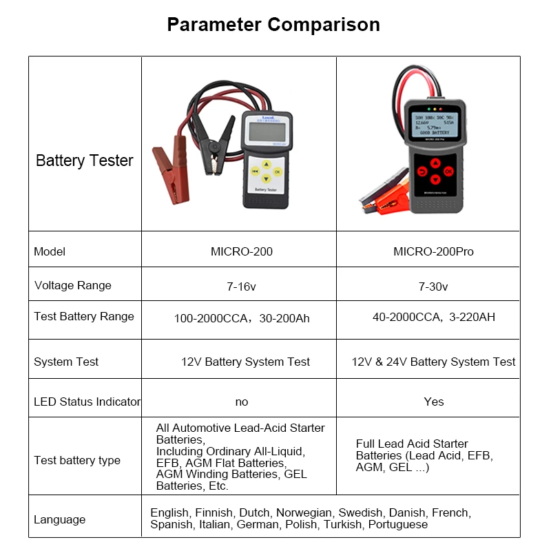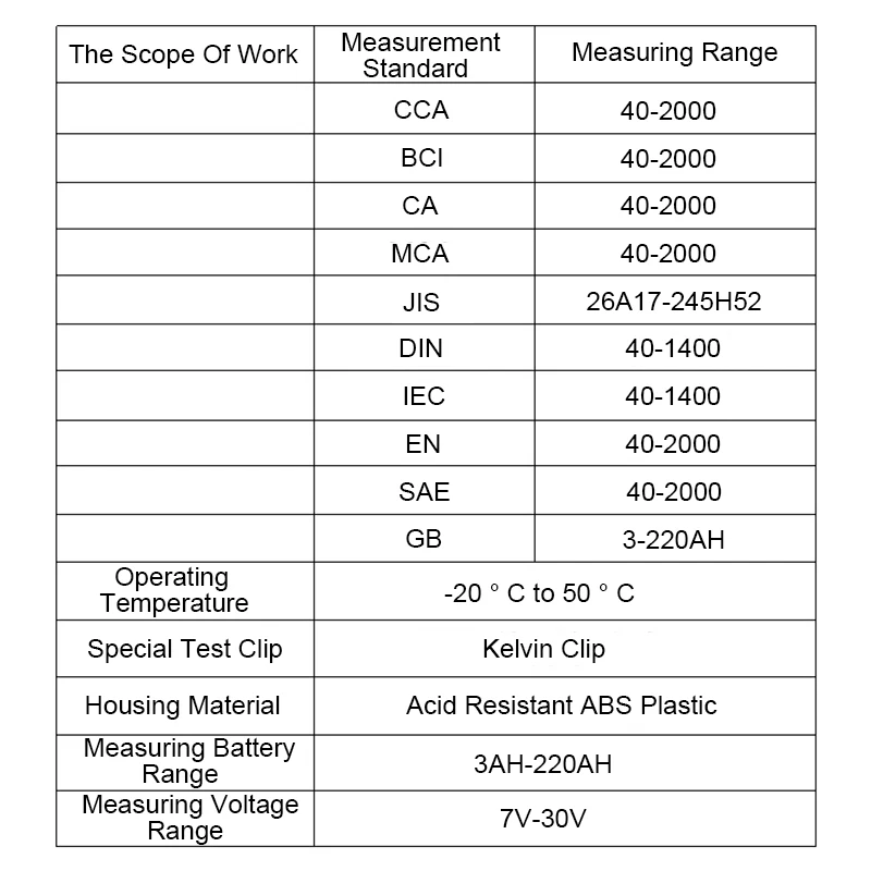 【A Must Tool For Car Owner】Professional battery tester applied for automobile. The measure range is 40-2000CCA . It covers all battery rating Standards such as CCA, BCI, CA, MCA, JIS, DIN, IEC, EN, SAE, GB .Suitable for most types of 12V lead-acid batteries including Regular Floded,AGM,GEL and EFB etc.