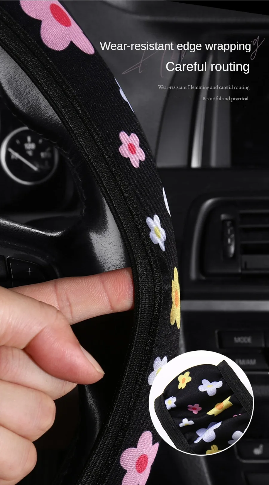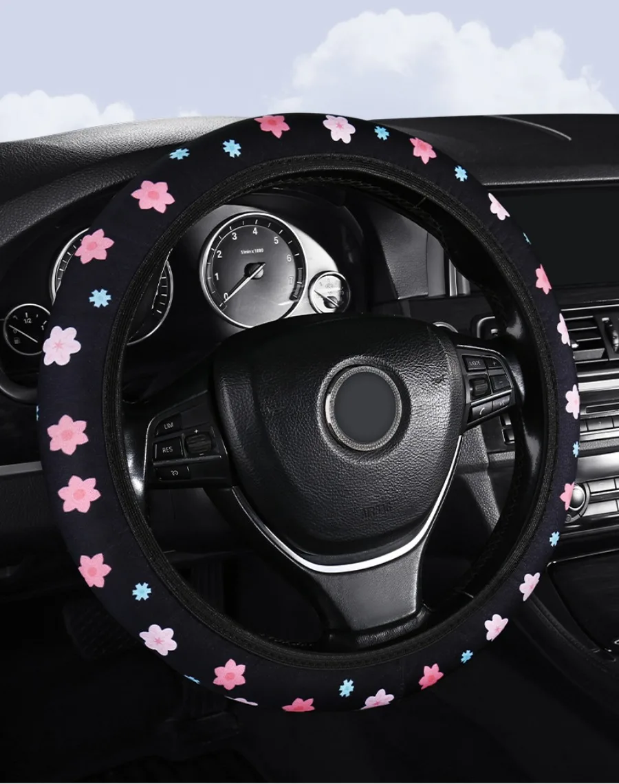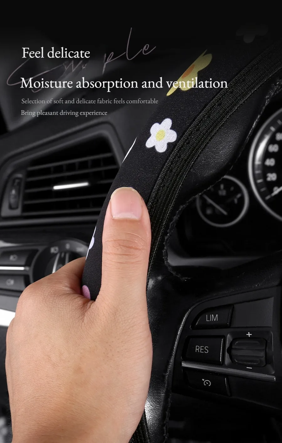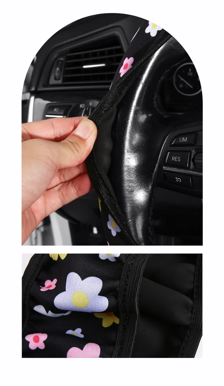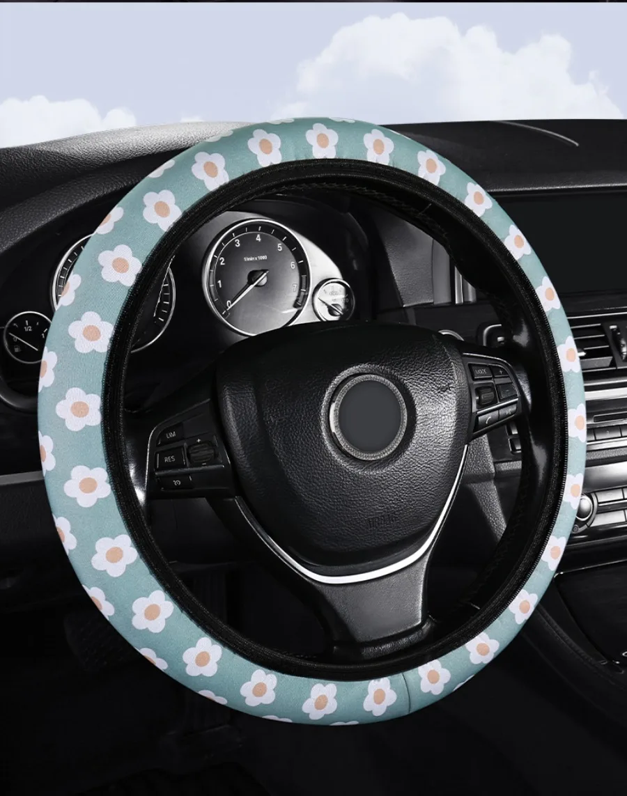 really cute just like the picture. i did have to use another set of hands to get this to fit my car steering wheel but when I did get it on it did stay. I'll update in a month or so to say how it holds up and how driving withh it goes. it's also very soft and plushy/velvet feeling which is very nice.