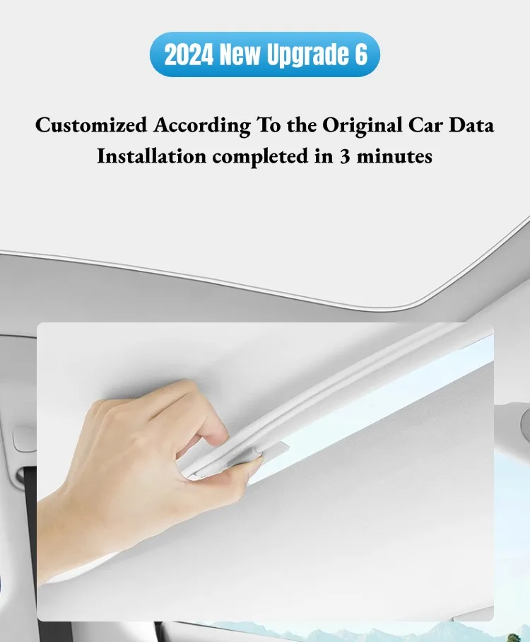 The Glass Roof Sunshade’s frame is made of alloy manganese steel, which is not easily deformed. The shade net is made of 6 layers of composite material. It effectively reduces UV rays and heat radiation and lowers the temperature inside the car without changing the car’s minimalist style.