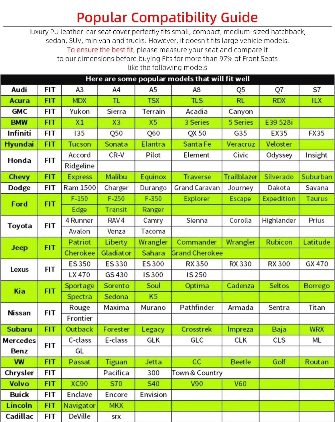 Universal Car Seat Covers-measures 20.47*19.29inches,suitable for all cars, Suv, trucks and rare vans etc. It doesn’t fit the seat of Full-Size Truck such as Silverado, TUNDRA,F-150 and full-Size SUV such as Tahoe, Expedition, Acadia etc. To ensure the best fit, please measure your seat and compare it to our dimensions before buying.