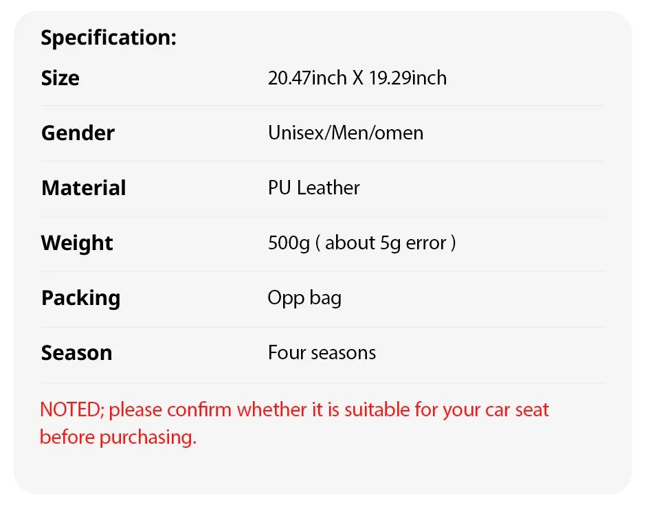 • Durable Material :Crafted from double-stitched faux leather, these seat covers offer durability and longevity, ensuring they last through all four seasons.