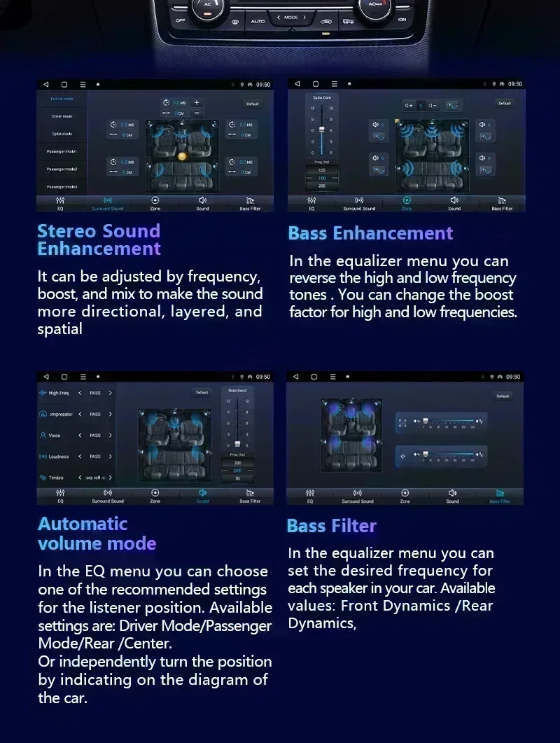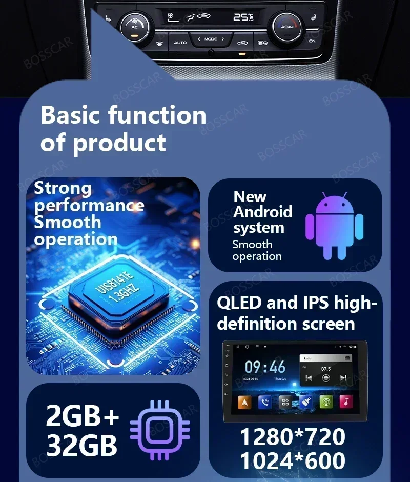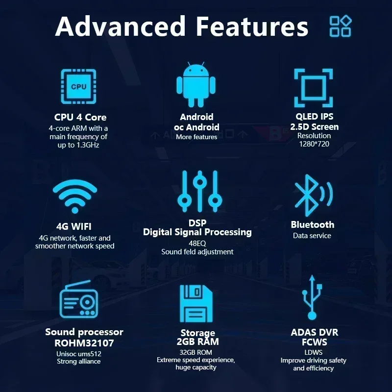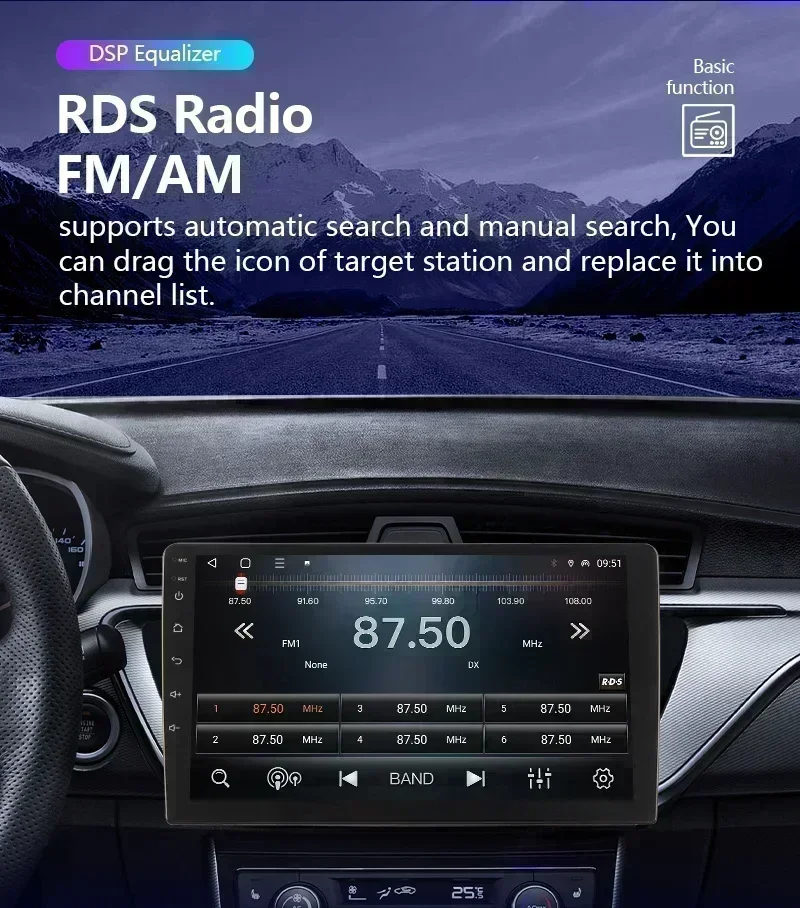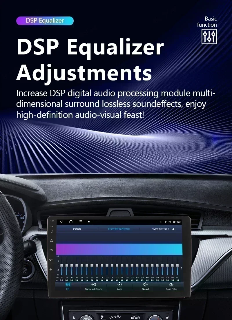 7/9/10-inch 2.5D tempered glass mirror, touch sensitive, high-definition 1080p resolution. Support multiple national languages. Support the rear data line USB input. Support equalizer to improve sound quality, use EQ to adjust sound. Support USB, external driving recorder (DVR) input (only applicable to DVR with APP).