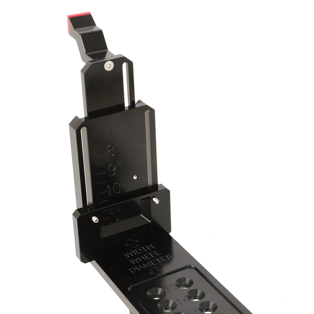 1. For best results in seeing how a wheel will fit when your suspension is preloaded. Before jacking up your car, measure the distance between the ground and your lower control arm. Then, after jacking up your car, taking the wheel off, attaching the tool, and setting your sizes. Lower the car back down but with some wood under that hub until the lower control arm is at the same height as the car sat previously. This will show you where the outer lip of a wheel would sit in relation to the fender when the car is at ride height.